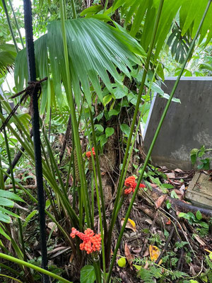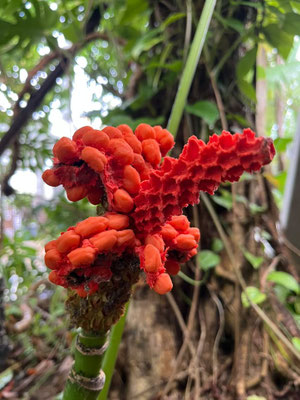 温室のパナマ草も今まさに穂が熟してきて赤い部分がめくれて来ました。